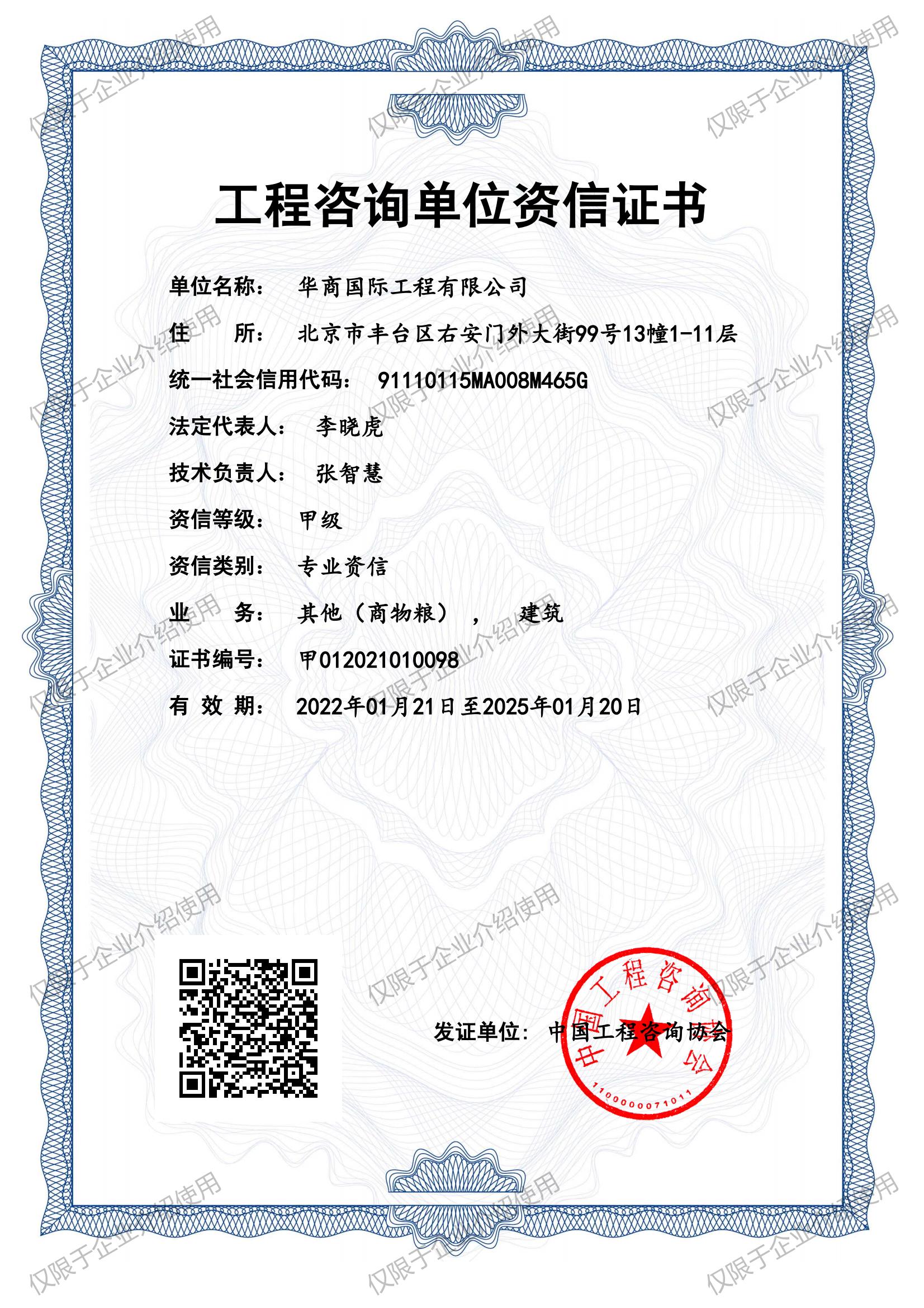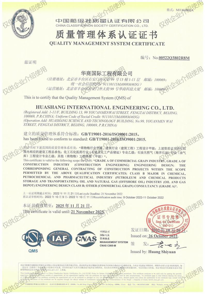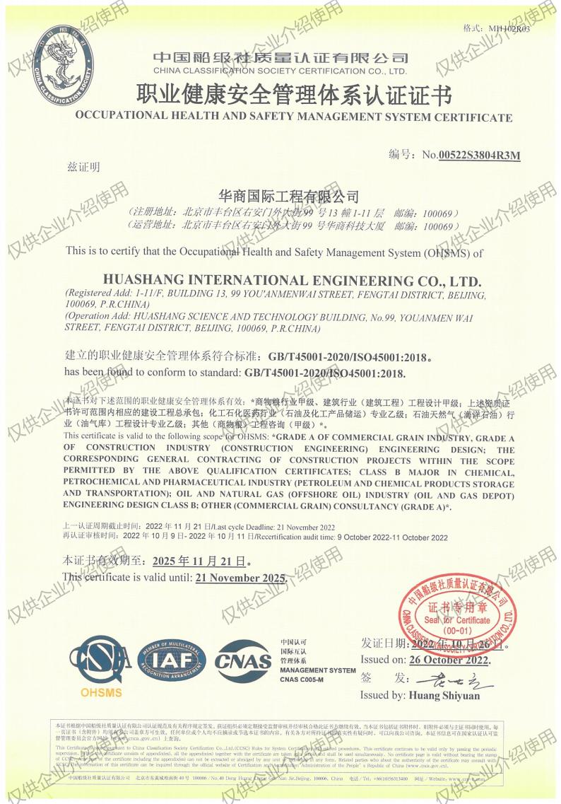 As a leading professional engineering Chinese company in the commercial grain industry, which has the qualifications of engineering consulting, engineering design, urban planning, construction supervision, construction cost consulting, general contracting of construction engineering, and mechanical & electrical engineering covering agricultural food, cold chain logistics, civil construction, Ice & Special Refrigeration, petroleum storage and transportation, biological medicine, and other areas—providing customers with the whole industry chain and complete life cycle services in agricultural, grain and food, and cold chain logistics engineering. Since Huashang International Engineering Co., Ltd. has established in 1954, the company completed more than 4,000 projects in professional fields, covering all provinces and cities in China and more than 50 countries and regions worldwide.