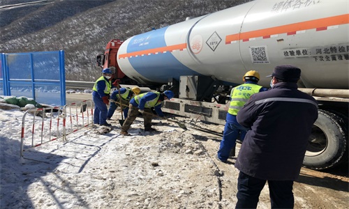 2月14日延慶賽區(qū)突降大雪,上山道路積雪結(jié)冰給項目部帶來巨大挑戰(zhàn),為第二次系統(tǒng)充氨工作再造險阻。惡劣的天氣使得20噸液氨罐車2月16日才得以上山,但卻由于項目現(xiàn)場地面積雪結(jié)冰,車輛多次調(diào)整都因地面打滑未成功入位,王鋒同志立即組織項目部人員利用各種可以使用的工具進行人工除雪、砸冰,在歷經(jīng)兩個多小時的除冰作業(yè)后終于使得罐車進入指定位置,順利完成系統(tǒng)的第二次整體充氨工作。